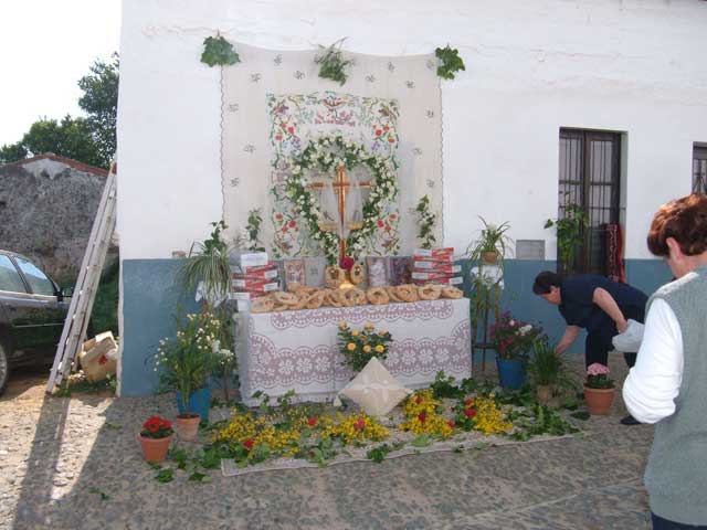 The end of April and the start of MAY see the Festival of the Cruces (crosses) celebrated throughout the Sierra. In Cortelazor groups of neighbours and their families work to raise and decorate six shrines topped with crosses which are placed throughout the village. The emphasis in the decoration is on beauty rather than opulence, and these simple statements of faith are blessed in the course of a cavalcade around the village led by the local priest and the image of the Virgin from the village church. Apart from Cortelazor, the most famous celebration of the Cruces takes place in Hinojales, where the young men of the town dress in their striking local costumes and dance BACKWARDS through the streets in front of the float carrying their Virgin, in what is believed to be the Christianisation of an originally Celtic tradition.