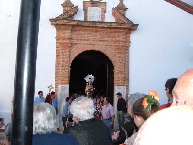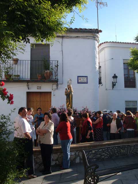 The whole of May in the Sierra is given over to the celebration of Romerias, or Pilgrimages, where all of the populations of the villages carry the image of their Virgin to or from their towns to the Lady's Hermitage usually located between 2 and 4 kilometres from the respective villages. In Cortelazor, two weeks before the Romeria the Virgin is brought by the villagers, by hand-drawn cart from her Ermita of La Virgen Coronada 4 kilometres outside the village. She stays in the village church for the two weeks before being taken in cavalcade, with the whole village in attendance, and with those who want to take turns to carry her home allowed to have their opportunity.